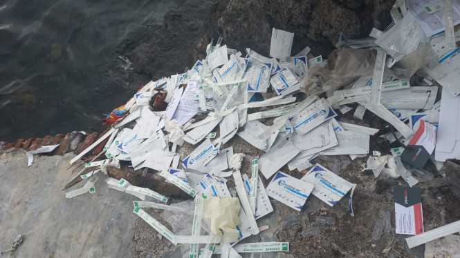 Limbah bekas alat swab yang ditemukan di sepanjang pesisir Kapuran, Banyuwangi. (Gambar: TvOne)